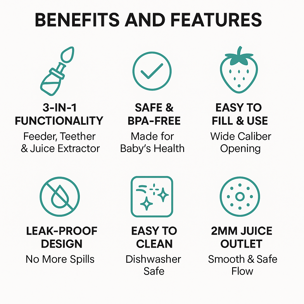 - 3-in-1 Design: Functions as a fruit feeder, teether, and juice extractor.